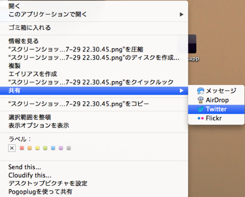 ツイートやFlickrにアップしたい時は右クリックの共有から選びます。